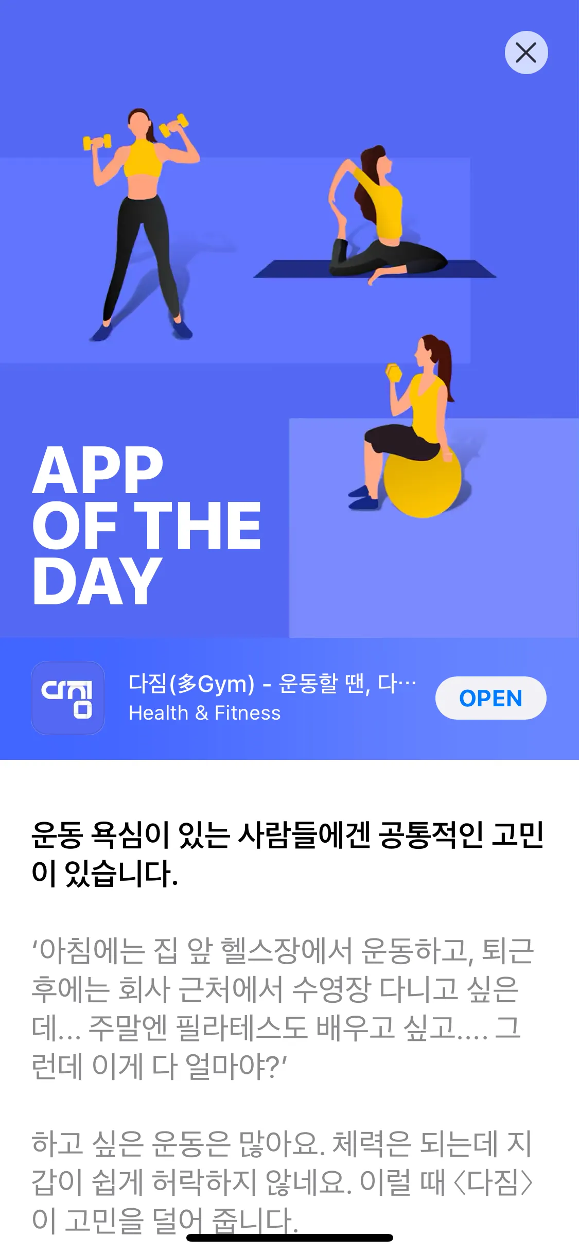 현재 다짐은 운동시설을 찾아보고 결제할 수 있는 서비스를 넘어 자신에게 꼭 맞는 트레이너 선생님을 찾아 1:1 P.T를 결제하거나 앱 내 채팅으로 소통할 수 있으며, 다짐마켓에서 운동에 필요한 식단도 꾸릴 수 있는 국내 1등 피트니스 플랫폼이 되었습니다.